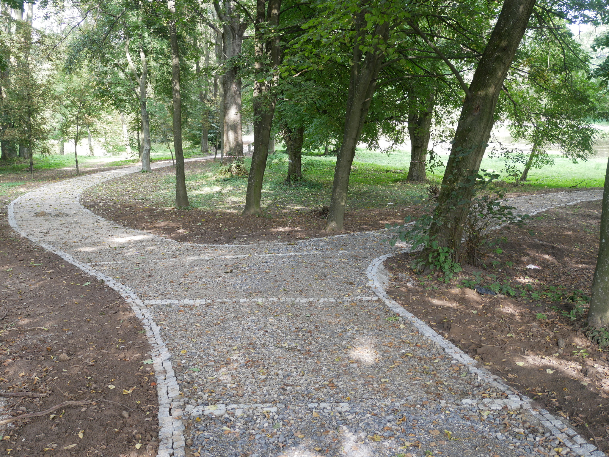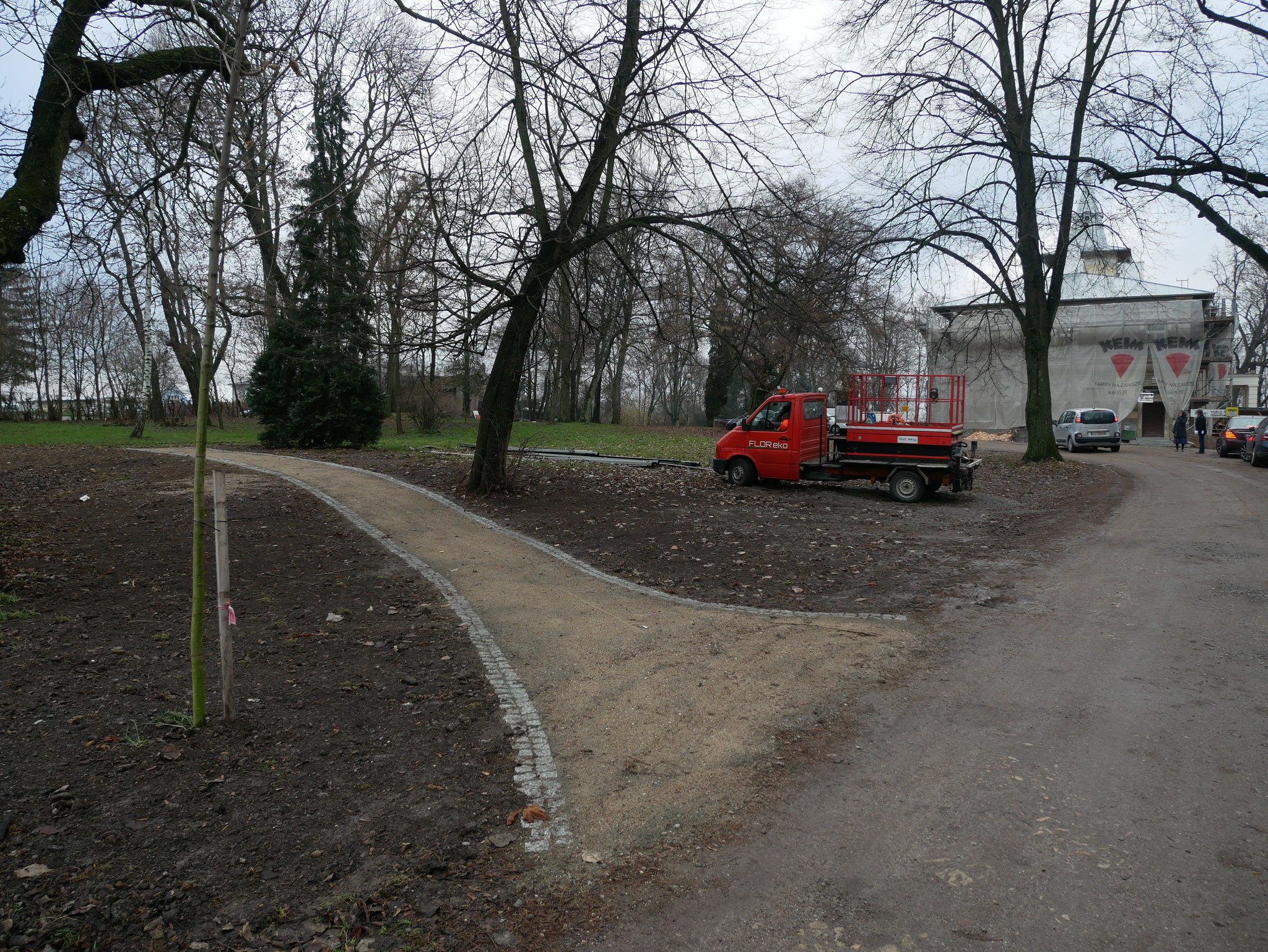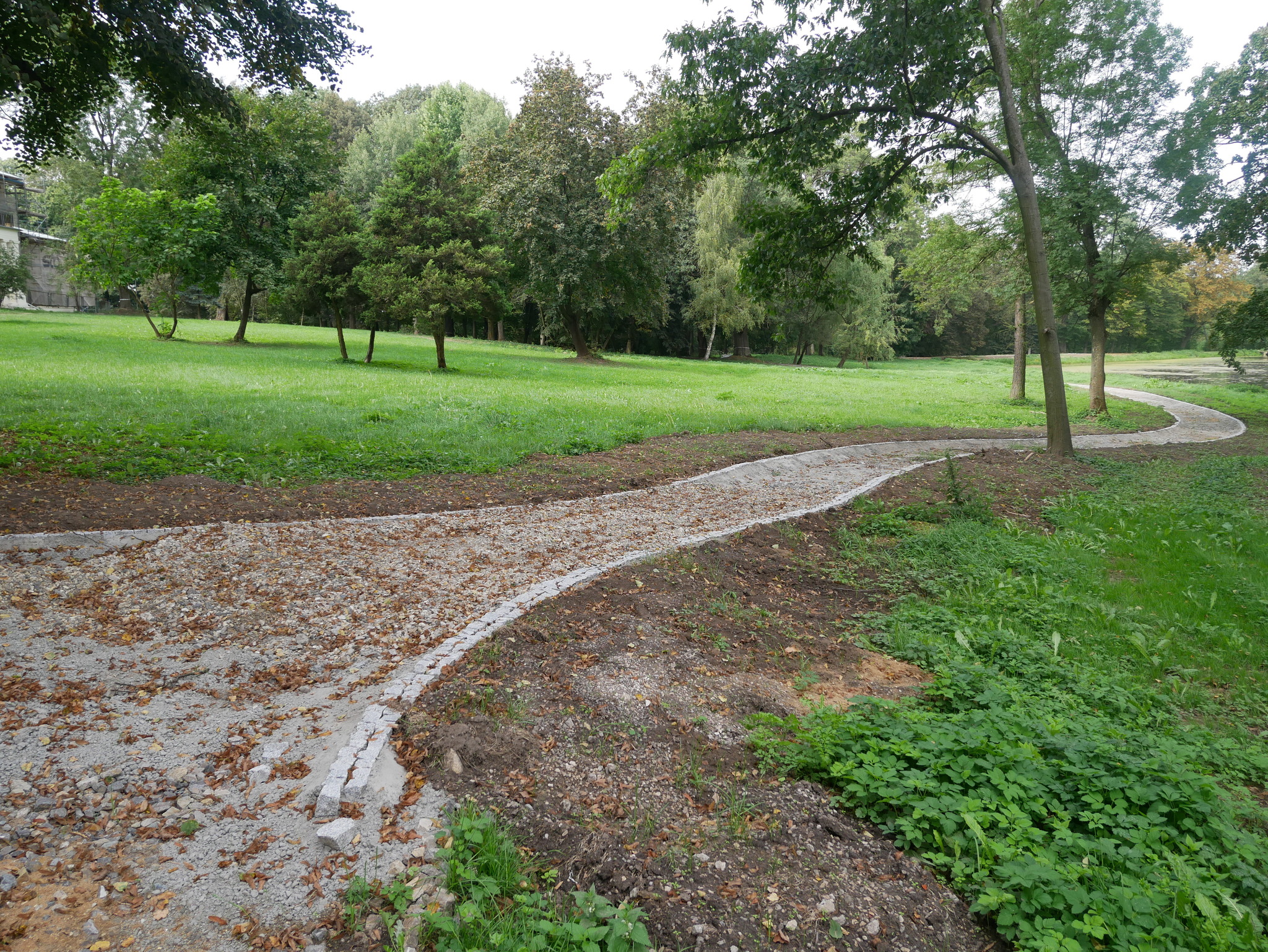 Prace na terenie parku obejmujące rewaloryzację parku: utwardzenie nawierzchni ciągów komunikacyjnych, prowadzące do odtworzenia historycznych treści i form zabytku sztuki ogrodowej z końca XIX w.