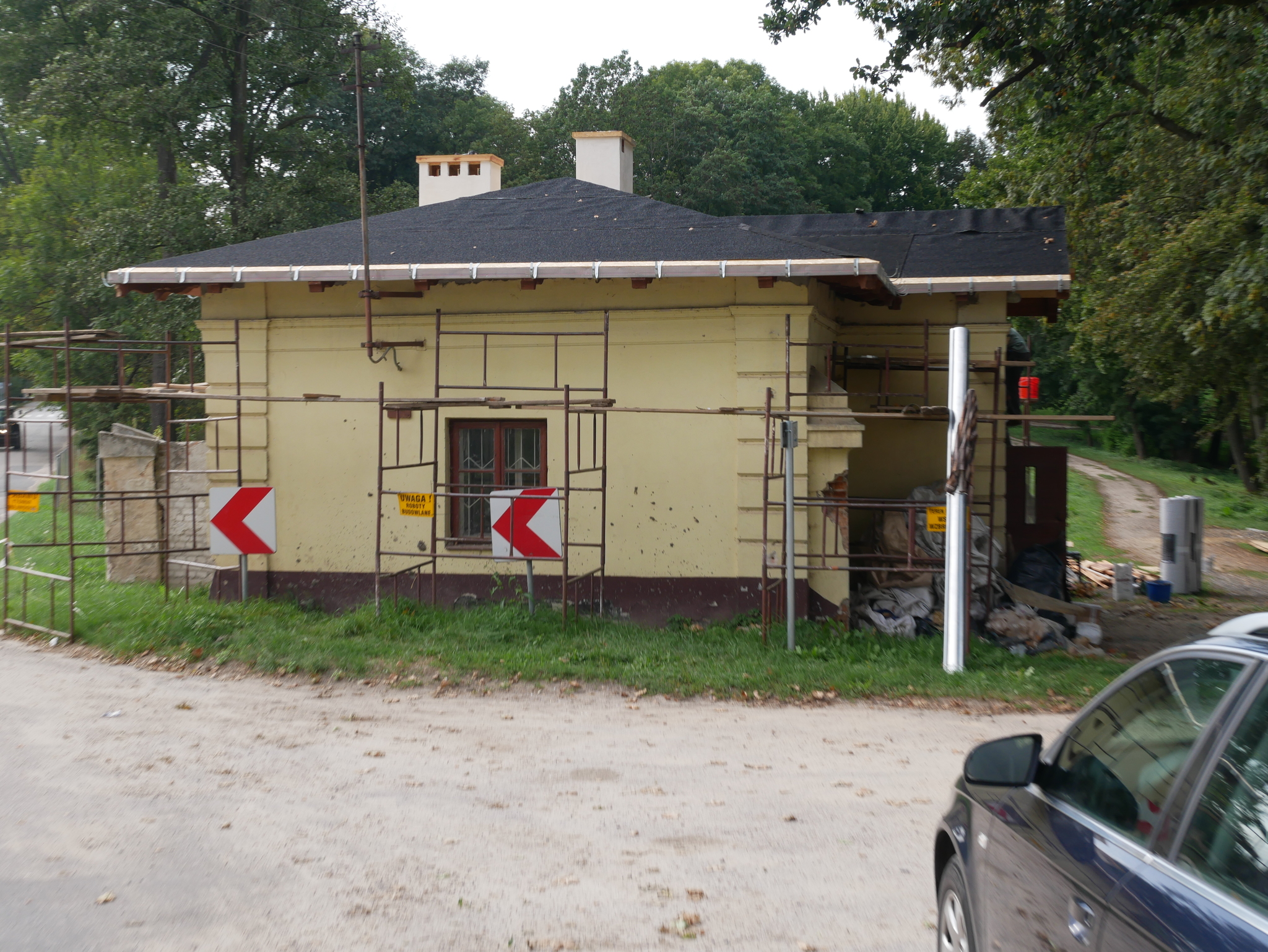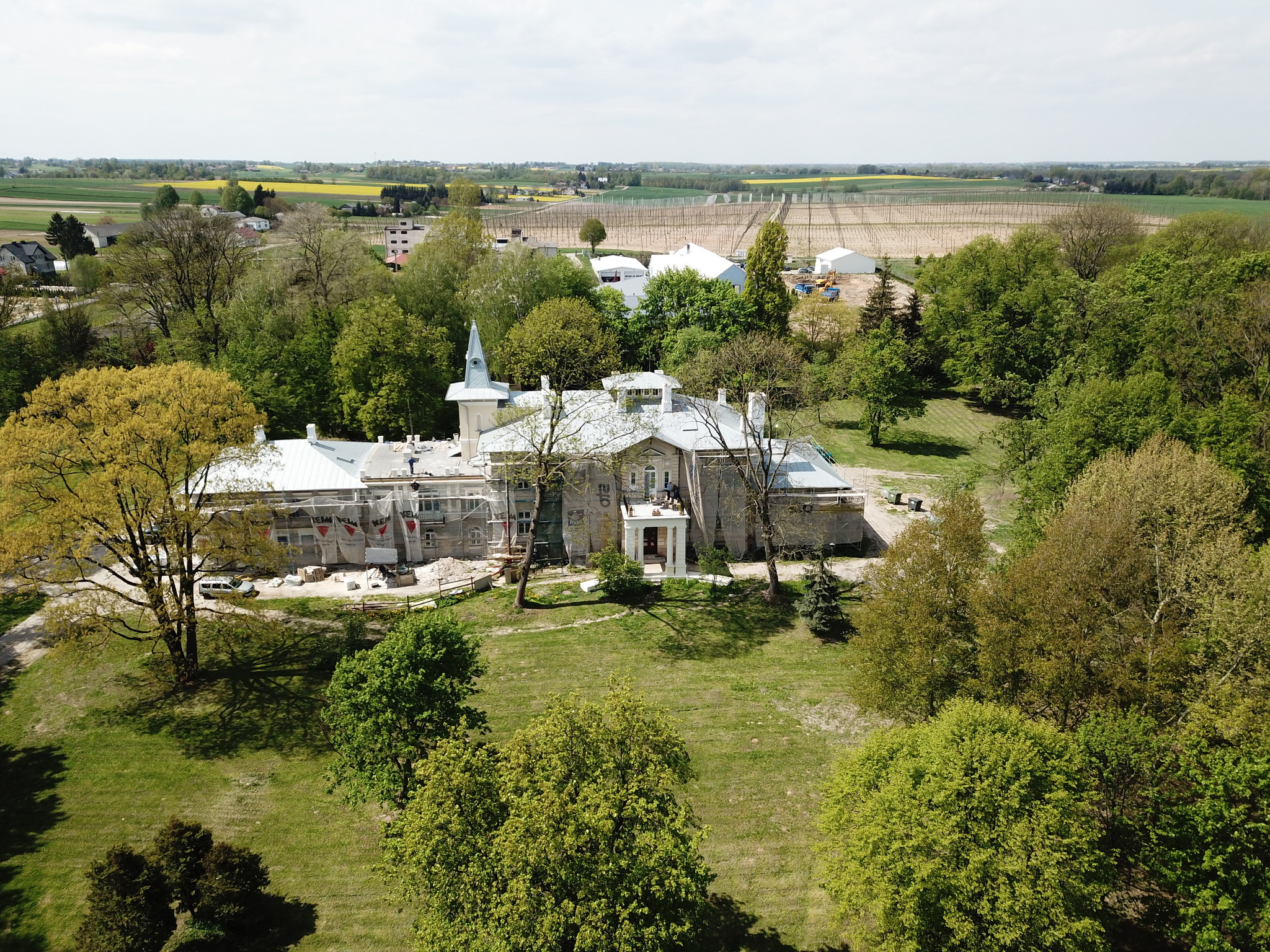 Prace budowlane/konserwatorskie przy kordegardzie wraz z adaptacją do pełnienia nowych funkcji użytkowych obejmujące: przeprowadzenie prac budowlanych polegających na wykonaniu robót ziemnych, remoncie ścian fundamentowych elewacji – przy zachowaniu oryginalnego detalu architektonicznego, tynki gładkie, kolorystyka tożsama kolorystyką pałacu, odnowienie pomieszczeń, ścian zewnętrznych i wewnętrznych, remoncie dachu przy zachowaniu istniejącej formy dachu z dekoracyjnymi ostatkami krokwi, nowe pokrycie dachowe z blachy płaskiej tytanowo-cynkowej (zgodnie z pokryciem przewidzianym dla dachu pałacu) wraz ze stropem, wykonanie posadzek i stolarki okiennej – drewnianej, powtarzającej historyczne podziały i drzwiowej (drzwi płycinowe, drewniane) oraz wykonanie wokół budynku opaski izolacyjnej i odwadniającej (zalecana kostka granitowa).