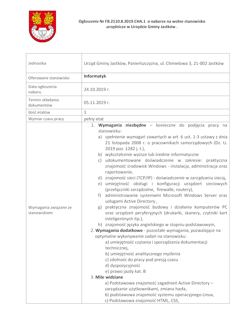 - przesłać pocztą do dnia 05.11.2019 r. – (decyduje data wpływu do urzędu) na adres: Urząd Gminy Jastków Panieńszczyzna, ul. Chmielowa 3, 21-002 Jastków z dopiskiem: Nabór FB.2110.8.2019.CHA.1 na stanowisko Informatyk.