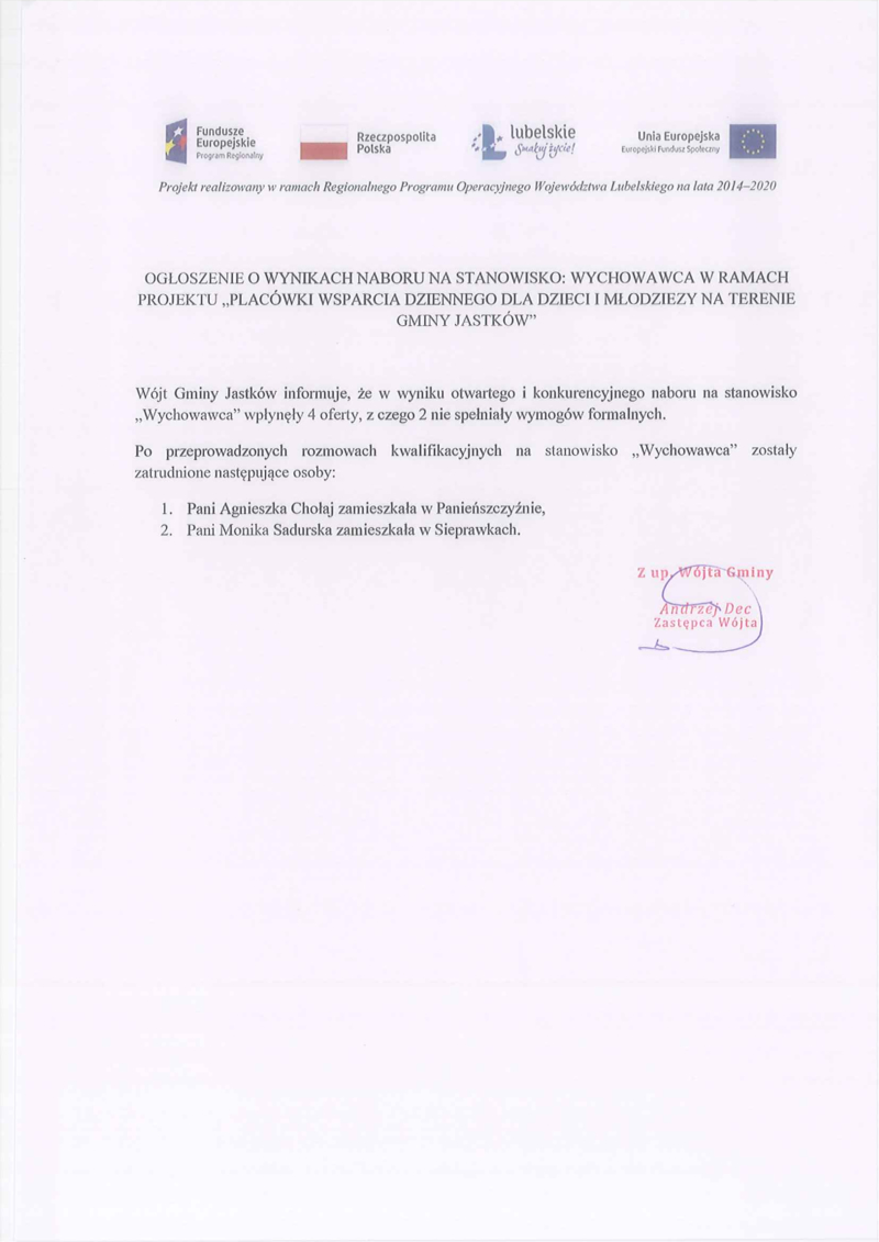 OGŁOSZENIE O WYNIKACH NABORY NA STANOWISKO: WYCHOWAWCA