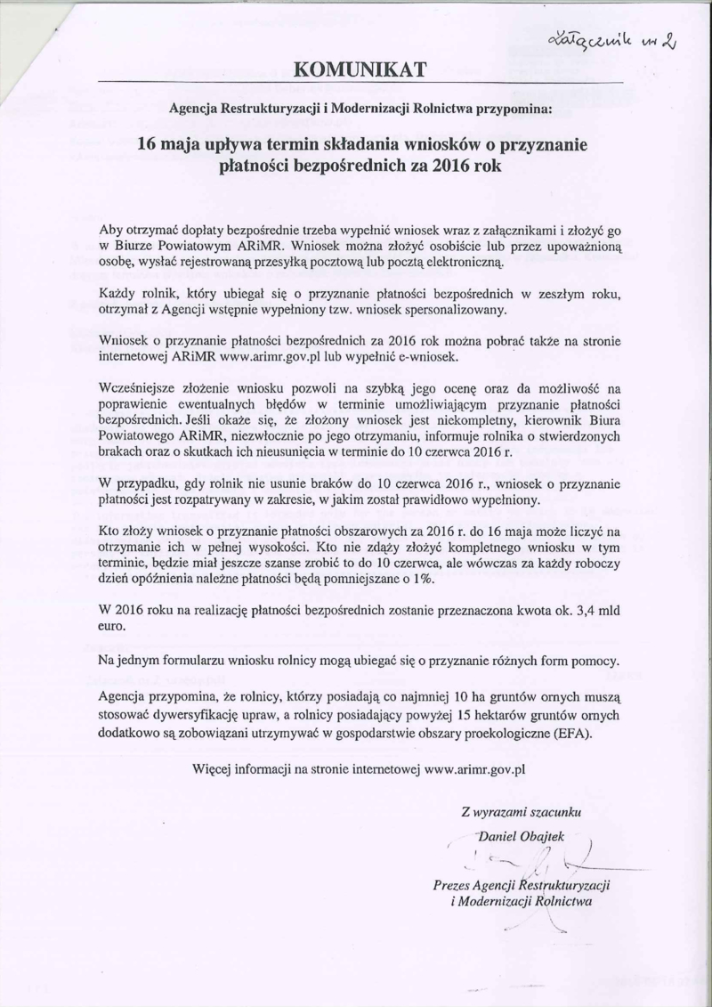 16 MAJA UPŁYWA TERMIN SKŁADANIA WNIOSKÓW O PRZYZNANIE PŁATNOŚCI BEZPOŚREDNICH ZA 2016 ROK