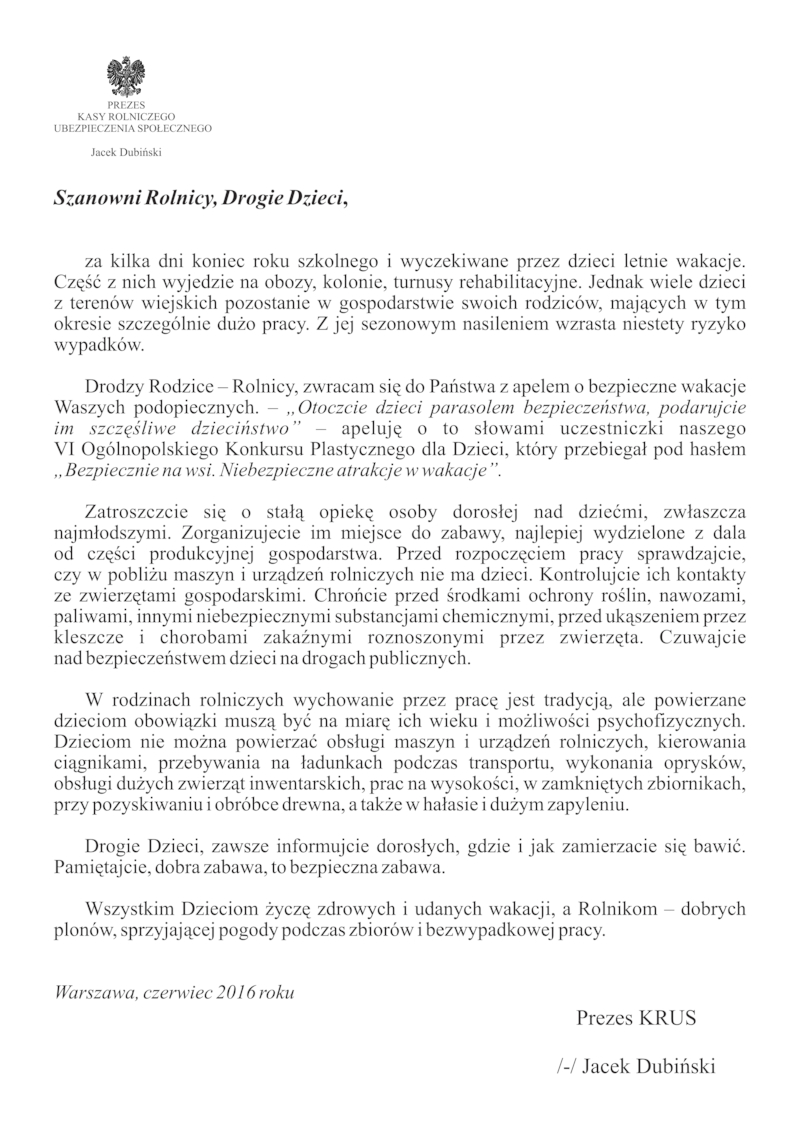 Apel Prezesa KRUS do rodziców dzieci spędzających wakacje na wsi.