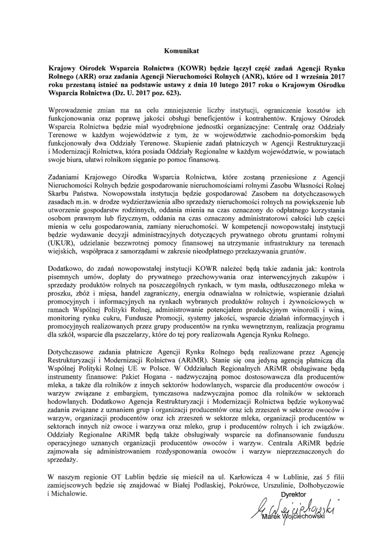 KOMUNIKAT KRAJOWEGO OŚRODKA WSPARCIA ROLNICTWA