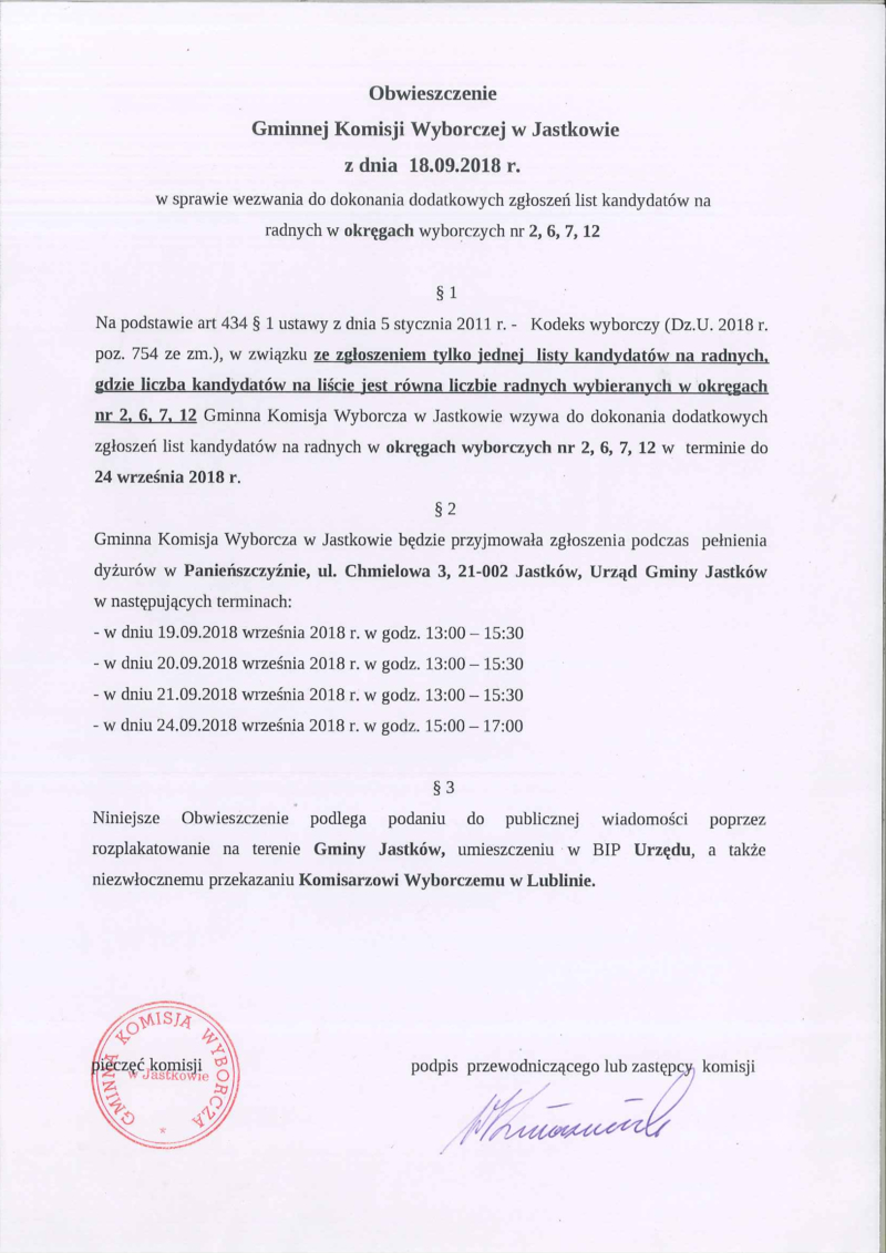 OBWIESZCZENIE GMINNEJ KOMISJI WYBORCZEJ W JASTKOWIE Z DNIA 18.09.2018R W SPRAWIE WEZWANIA DO DOKONANIA DODATKOWYCH ZGŁOSZEŃ LIST KANDYDATÓW NA RADNCYH W OKRĘGACH WYBORCZYCH NR 2,6,7,12