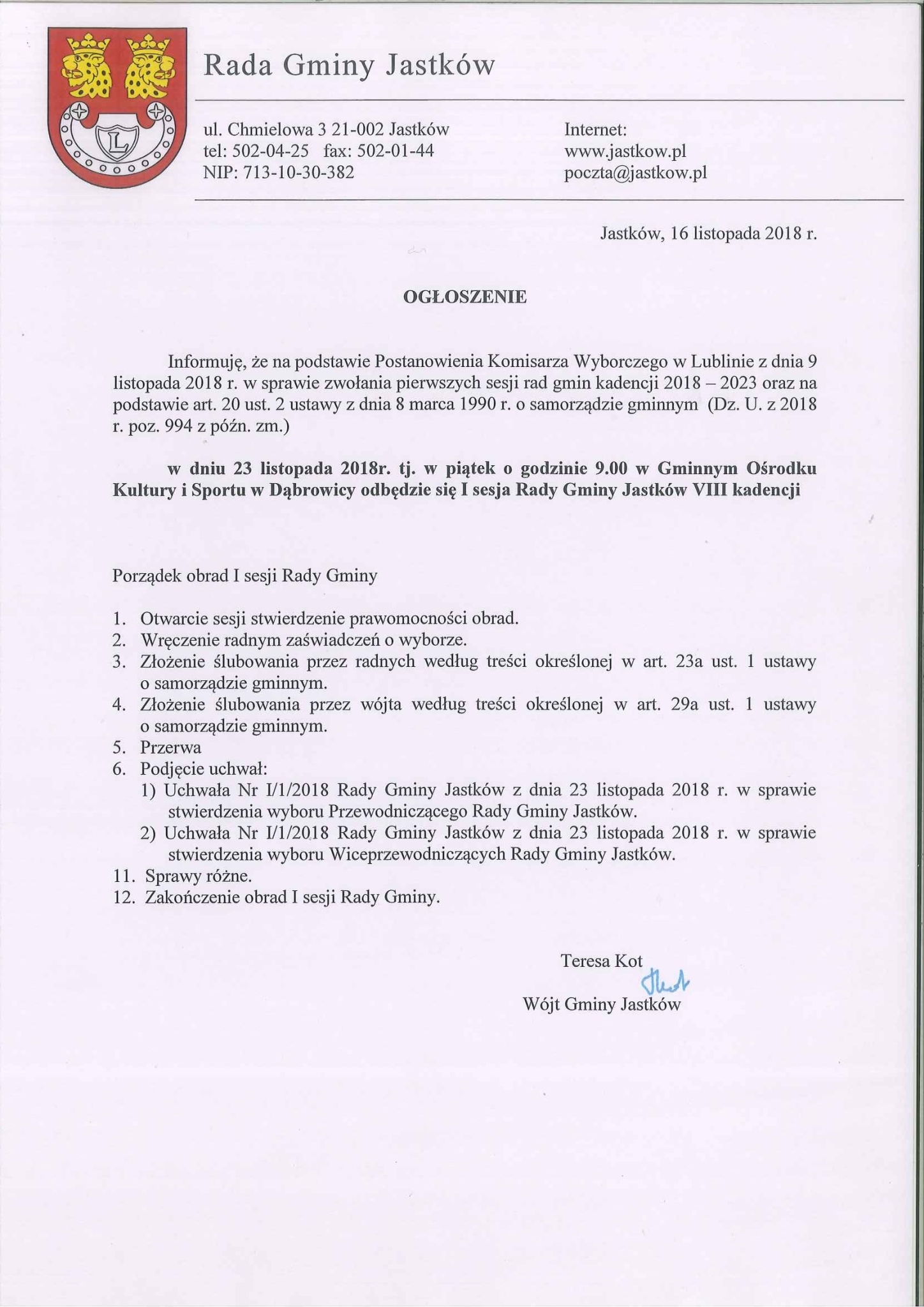 OGŁOSZENIE O I SESJI RADY GMINY VIII KADENCJI