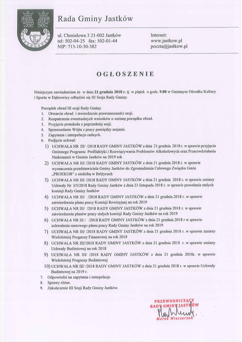 OGŁOSZENIE O III SESJI RADY GMINY JASTKÓW