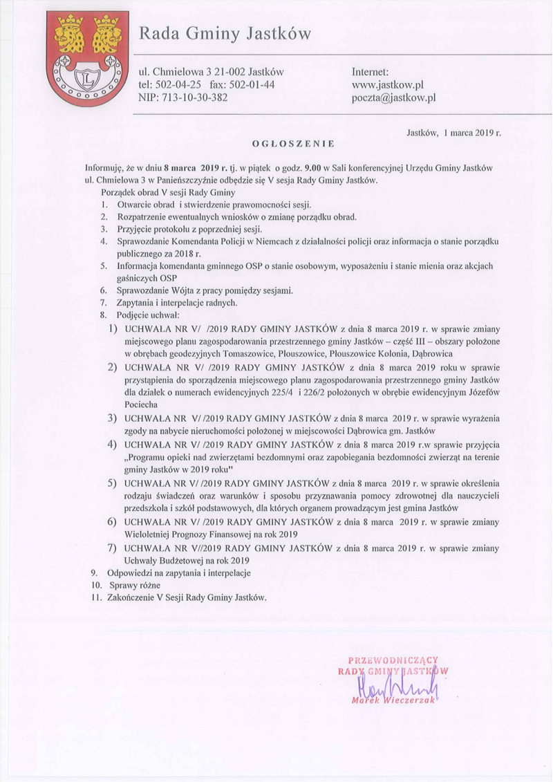 OGŁOSZENIE O V SESJI RADY GMINY JASTKÓW