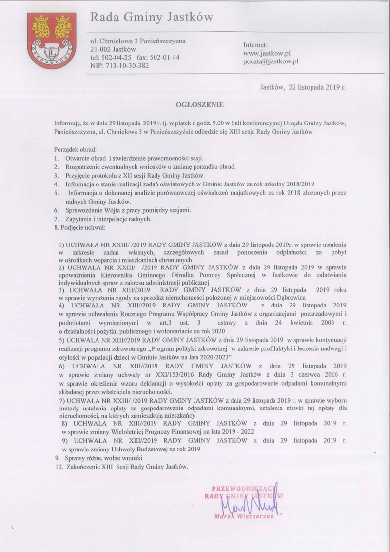 OGŁOSZENIE O XIII SESJI RADY GMINY W DNIU 29 LISTOPADA 2019 R.