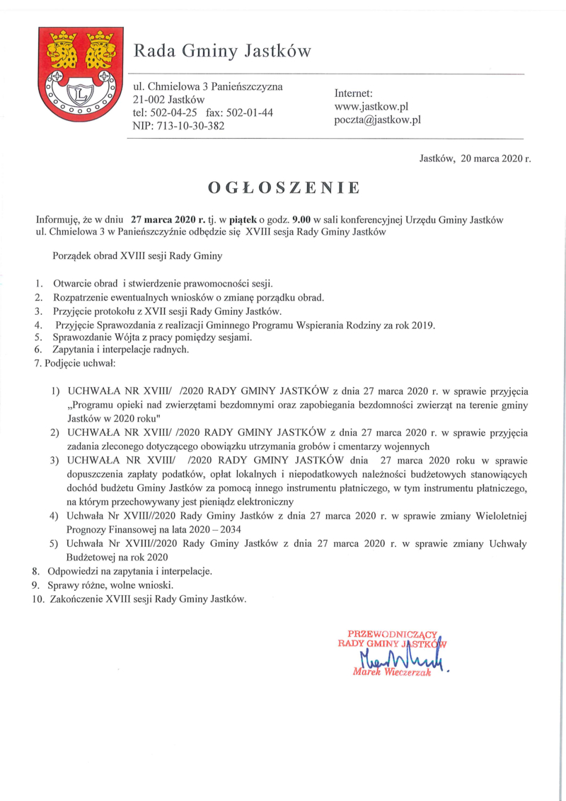 OGŁOSZENIE O XVIII SESJI RADY GMINY JASTKÓW W DNIU 27 MARCA 2020 R.