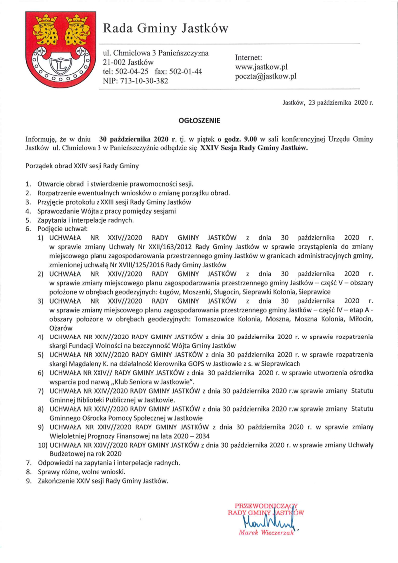 OGŁOSZENIE O XXIV SESJI RADY GMINY