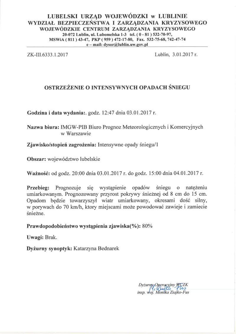 OSTRZEŻENIE O INTENSYWNYCH OPADACH ŚNIEGU