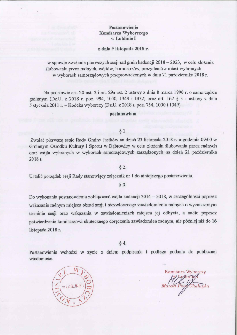 POSTANOWIENIE KOMISARZA WYBORCZEGO W LUBLINIE I Z DNIA 9 LISTOPADA 2018R. W SPRAWIE ZWOŁANIA PIERWSZYCH SESJI RAD GMIN KADENCJI 2018 - 2023, W CELU ZŁOŻENIA ŚLUBOWANIA PRZEZ RADNYCH, WÓJTÓW, BURMISTRZÓW, PREZYDENTÓW MIAST WYBRANYCH W WYBORACH SAMORZĄDOWYCH PRZEPROWADZONYCH W DNIU 21 PAŹDZIERNIKA 2018R.