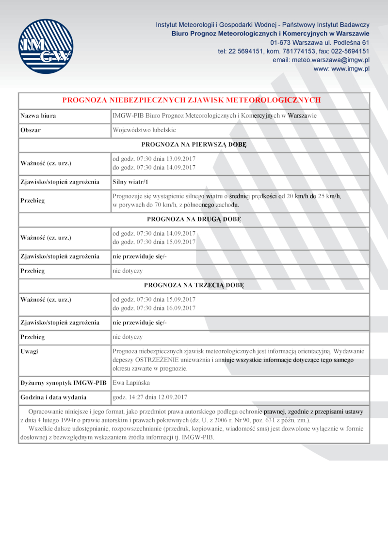PROGNOZA NIEBEZPIECZNYCH ZJAWISK METEOROLOGICZNYCH