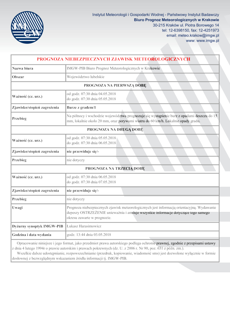 PROGNOZA NIEBEZPIECZNYCH ZJAWISK METEOROLOGICZNYCH