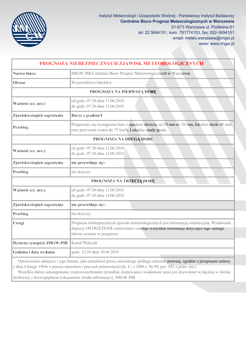 PROGNOZA NIEBEZPIECZNYCH ZJAWISK METEOROLOGICZNYCH