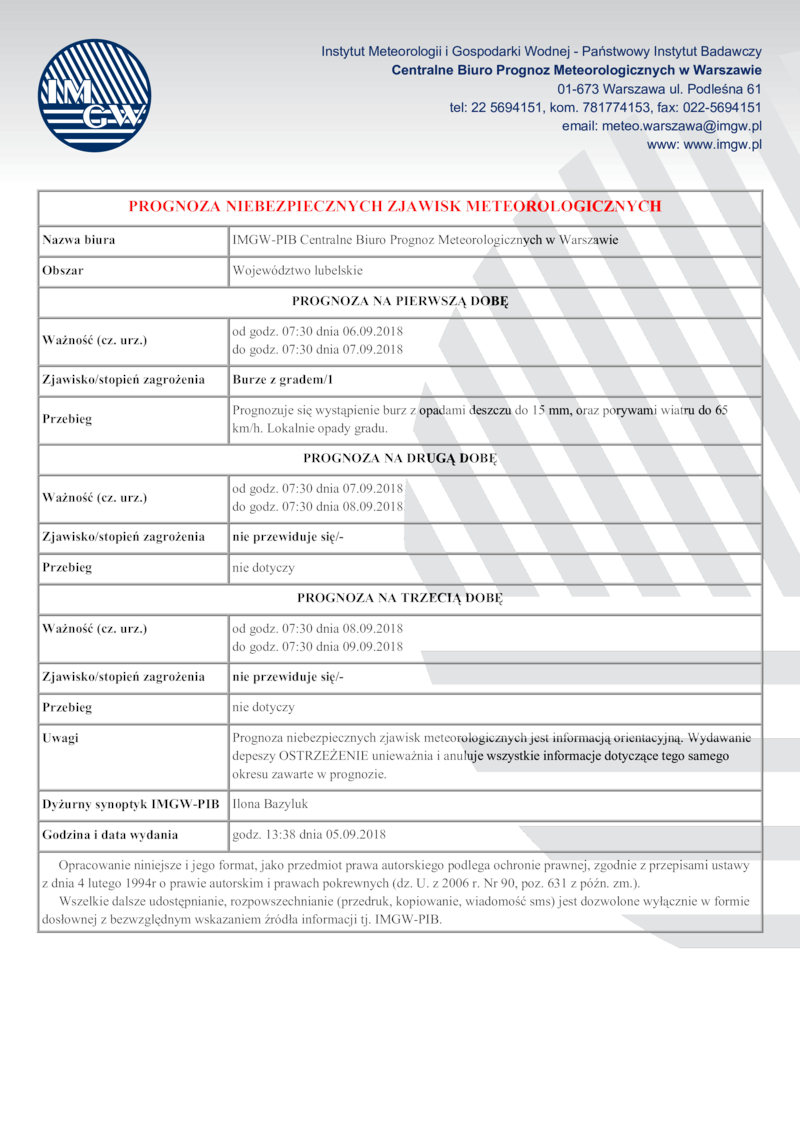 PROGNOZA NIEBEZPIECZNYCH ZJAWISK METEOROLOGICZNYCH