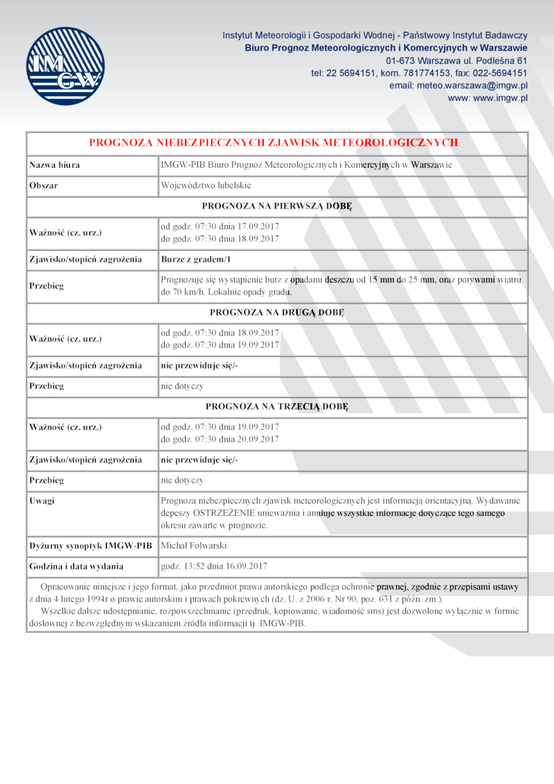 PROGNOZNA NIEBEZPIECZNYCH ZJAWISK METEOROLOGICZNYCH