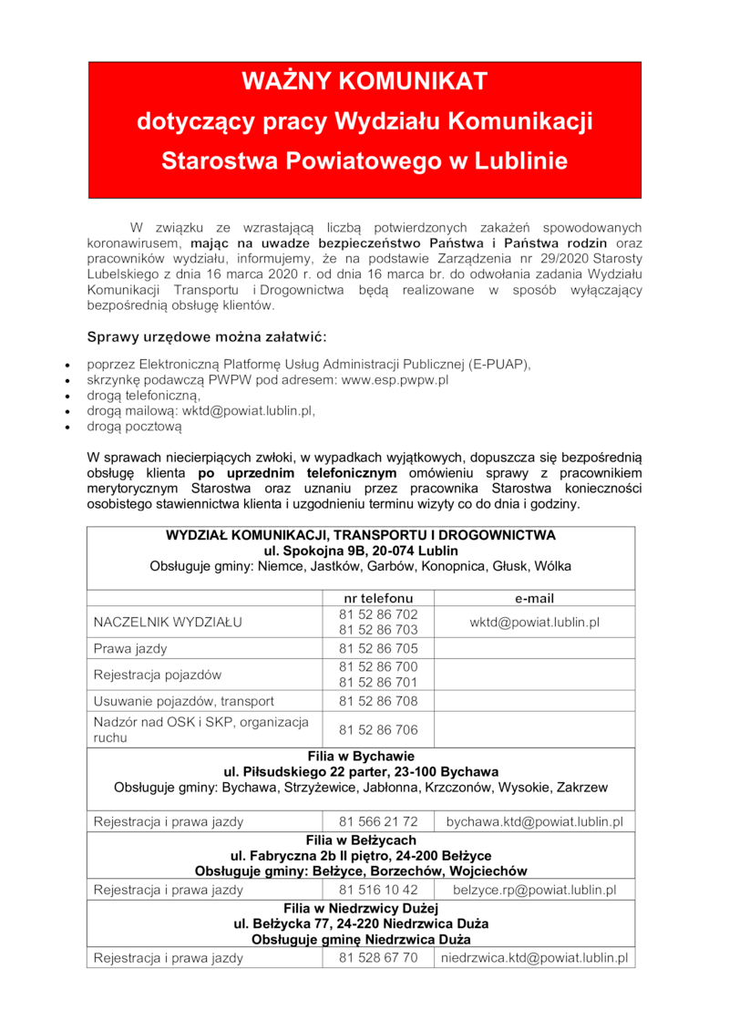 WAŻNY KOMUNIKAT DOTYCZĄCY PRACY WYDZIAŁU KOMUNIKACJI STAROSTWA POWIATOWEGO W LUBLINIE