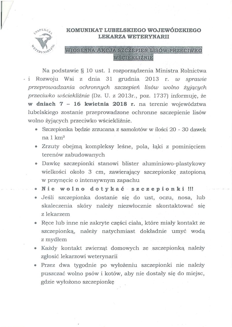 Komunikat Lubelskiego Wojewódzkiego lekarza weterynarii.