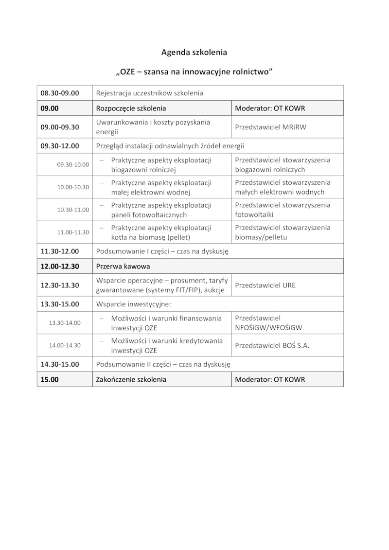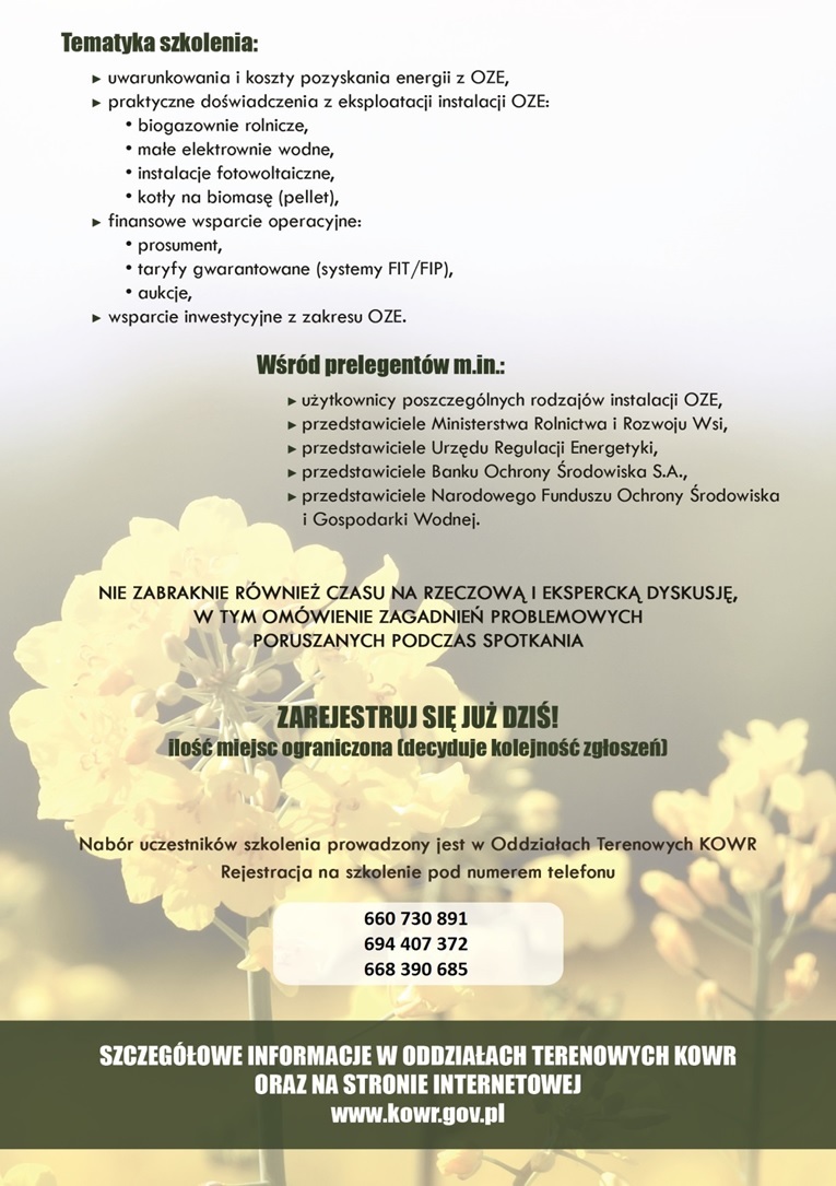 ZAPROSZENIE NA BEZPŁATNE SZKOLENIE "OZE - SZANSA NA INNOWACYJNE ROLNICTWO"