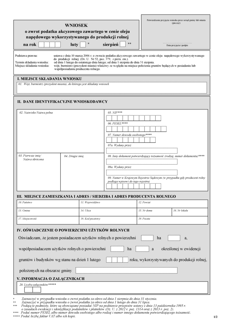 Zwrot przysługuje producentom rolnym, którzy byli w posiadaniu lub współposiadaniu użytków rolnych określonych w ewidencji gruntów i budynków oraz był posiadaczem gospodarstwa rolnego w momencie składania wniosku. W przypadku, gdy grunty gospodarstwa rolnego stanowią przedmiot współposiadania, zwrot podatku przysługuje temu współposiadaczowi, w stosunku do którego pozostali współposiadacze wyrazili pisemną zgodę (na wniosku). Pisemna zgoda nie dotyczy współmałżonków. Do wniosku należy dołączyć faktury VAT albo ich kopie (oryginały do wglądu), stanowiące dowód zakupu oleju napędowego w okresie od 1 lutego 2016 r. do 31 lipca 2016 r. (6 miesięcy poprzedzających miesiąc złożenia wniosku).