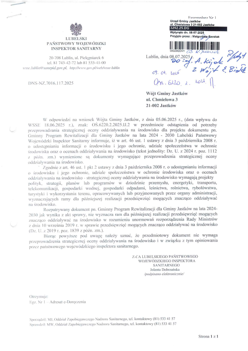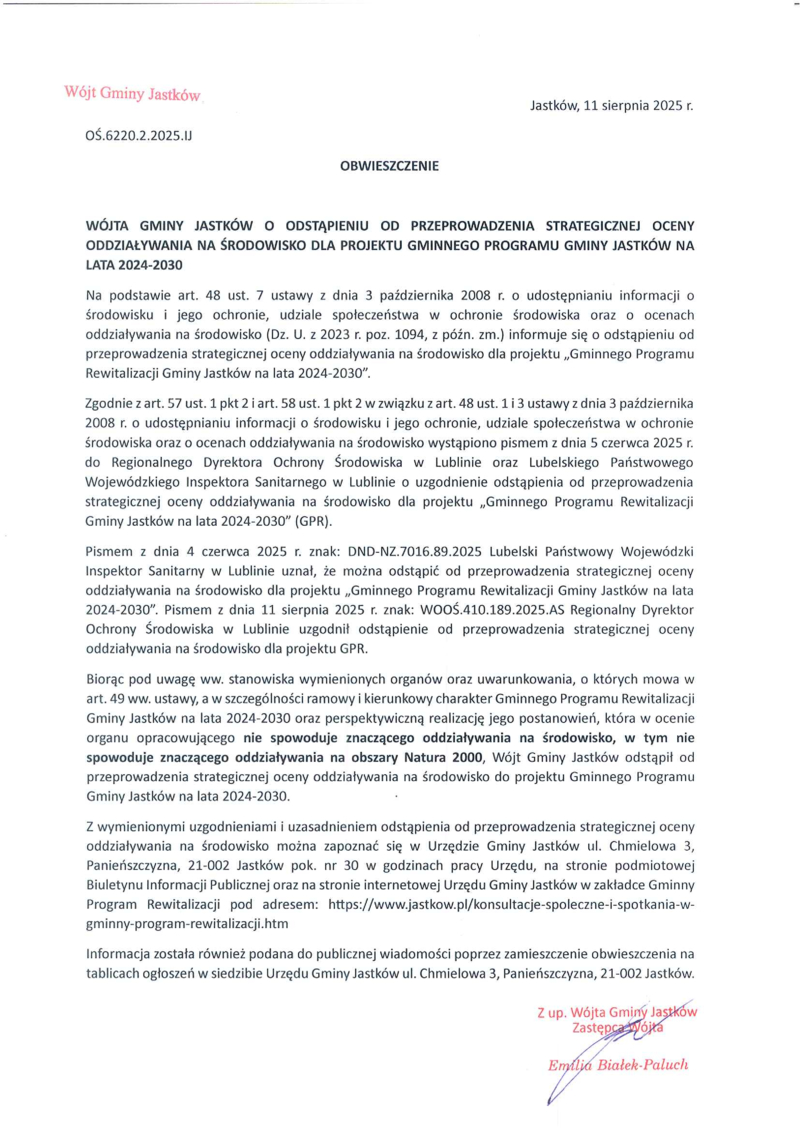 Na podstawie art. 48 ust. 7 ustawy z dnia 3 października 2008 r. o udostępnianiu informacji o środowisku i jego ochronie, udziale społeczeństwa w ochronie środowiska oraz o ocenach oddziaływania na środowisko (Dz. U. z 2023 r. poz. 1094, z późn. zm.) informuje się o odstąpieniu od przeprowadzenia strategicznej oceny oddziaływania na środowisko dla projektu „Gminnego Programu Rewitalizacji Gminy Jastków na lata 2024-2030”.