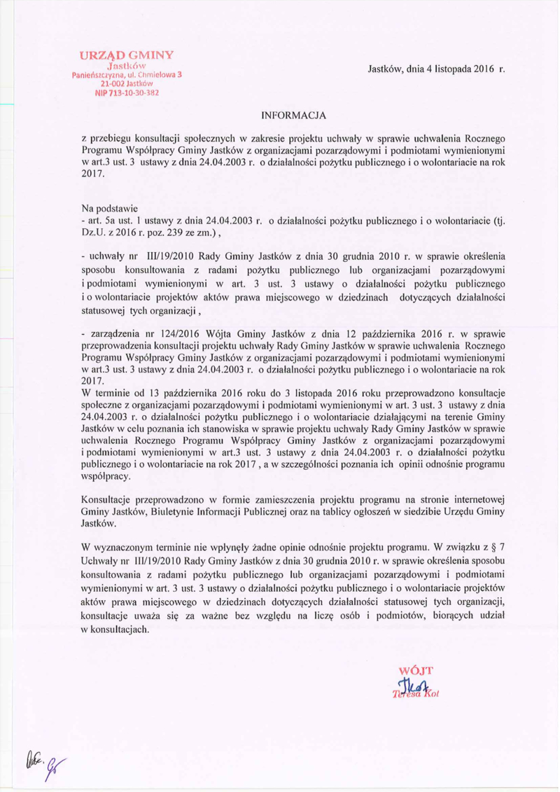 Informacja z przebiegu konsultacji społecznych w zakresie projektu uchwały w sprawie uchwalenia Rocznego Programu Współpracy Gminy Jastków z organizacjami pozarządowymi i podmiotami wymienionymi w art.3 ust. 3 ustawy z dnia 24.04.2003r. o działalności pożytku publicznego i o wolontariacie na rok 2017.