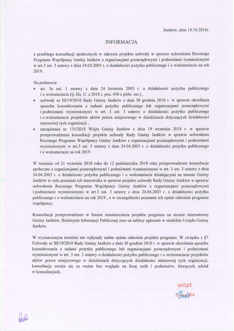 INFORMACJA Z PRZEBIEGU KONSULTACJI SPOŁECZNYCH W ZAKRESIE PROJEKTU UCHWAŁY W SPRAWIE UCHWALENIA ROCZNEGO PROGRAMU WSPÓŁPRACY GMINY JASTKÓW Z ORGANIZACJAMI POZARZĄDOWYMI I PODMIOTAMI WYMIENIONYMI W ART.3 UST. 3 USTAWY Z DNIA 24.04.2003R. O DZIAŁALNOŚCI POŻYTKU PUBLICZNEGO I O WOLONTARIACIE NA ROK 2019.