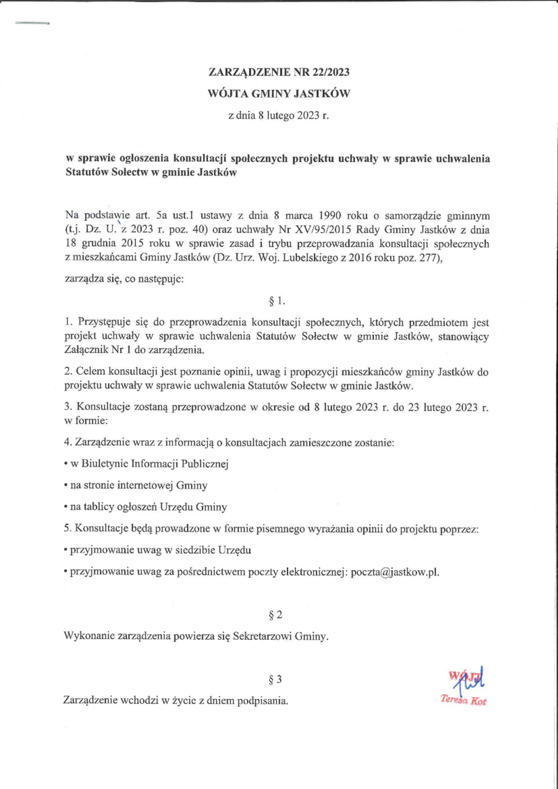 - ZARZĄDZENIE NR 22/2023 WÓJTA GMINY JASTKÓW z dnia 8 lutego 2023 r. w sprawie ogłoszenia konsultacji społecznych projektu uchwały w sprawie uchwalenia Statutów Sołectw w gminie Jastków 08 lut 2023 — 223 KB