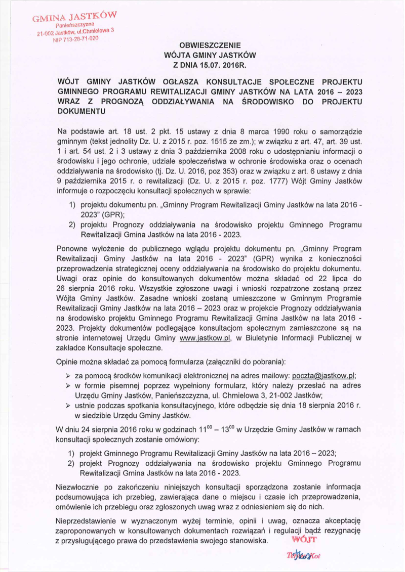 OBWIESZCZENIE WÓJTA GMINY JASTKÓW Z DNIA 15-07-2016R. W SPRAWIE OGŁOSZENIA KONSULTACJI SPOŁECZNYCH PROJEKTU GMINNEGO PROGRAMU REWITALIZACJI GMINY JASTKÓW NA LATA 2016-2023 WRAZ Z PROGNOZĄ ODDZIAŁYWANIA NA ŚRODOWISKO DO PROJEKTU DOKUMENTU