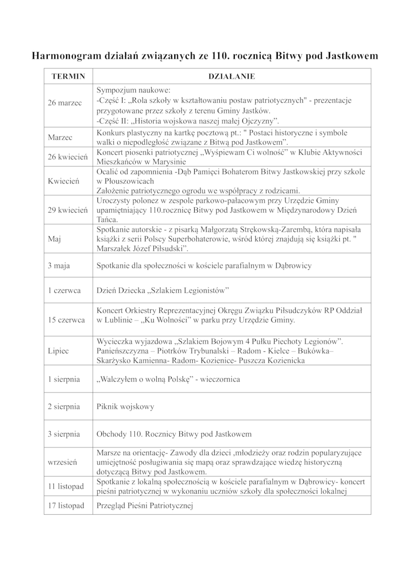 HARMONOGRAM UROCZYSTOŚCI I DZIAŁAŃ W RAMACH 110.ROCZNICY BITWY POD JASTKOWEM