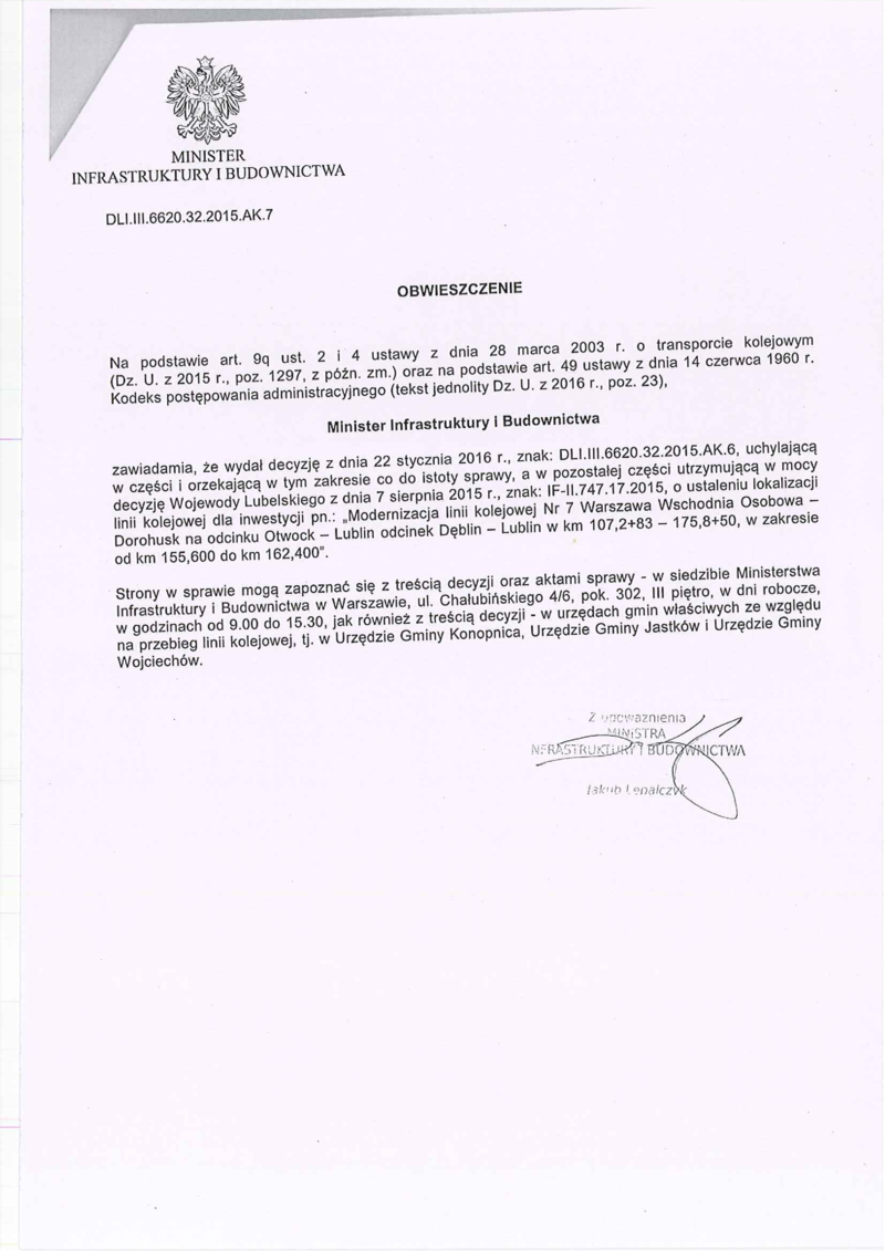 OBWIESZCZENIE MINISTRA INFRASTRUKTURY I BUDOWNICTWA, LDI.III.6620.32.2015.AK.7