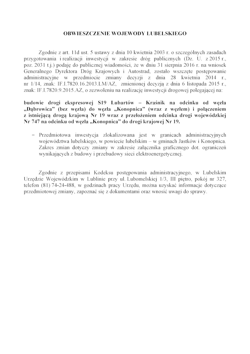 Obwieszczenie Wojewody Lubelskiego o wszczęciu postępowania w sprawie zmiany decyzji z dnia 28 kwietnia 2014r., nr 1/14 o zezwoleniu na realizację inwestycji drogowej polegającej na budowie drogi ekspresowej S19 Lubartów-Kraśnik na odcinku od węzła "Dąbrowica" (bez węzła) do węzła "Konopnica" i połączeniem z istniejącą DK nr 19...