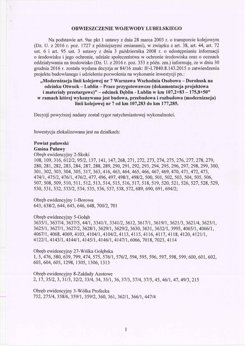 Obwieszczenie Wojewody Lubelskiego o wydaniu w dniu 30 grudnia 2016r. decyzji nr 84/16, znak: IF-I.7840.8.143.2015.AO