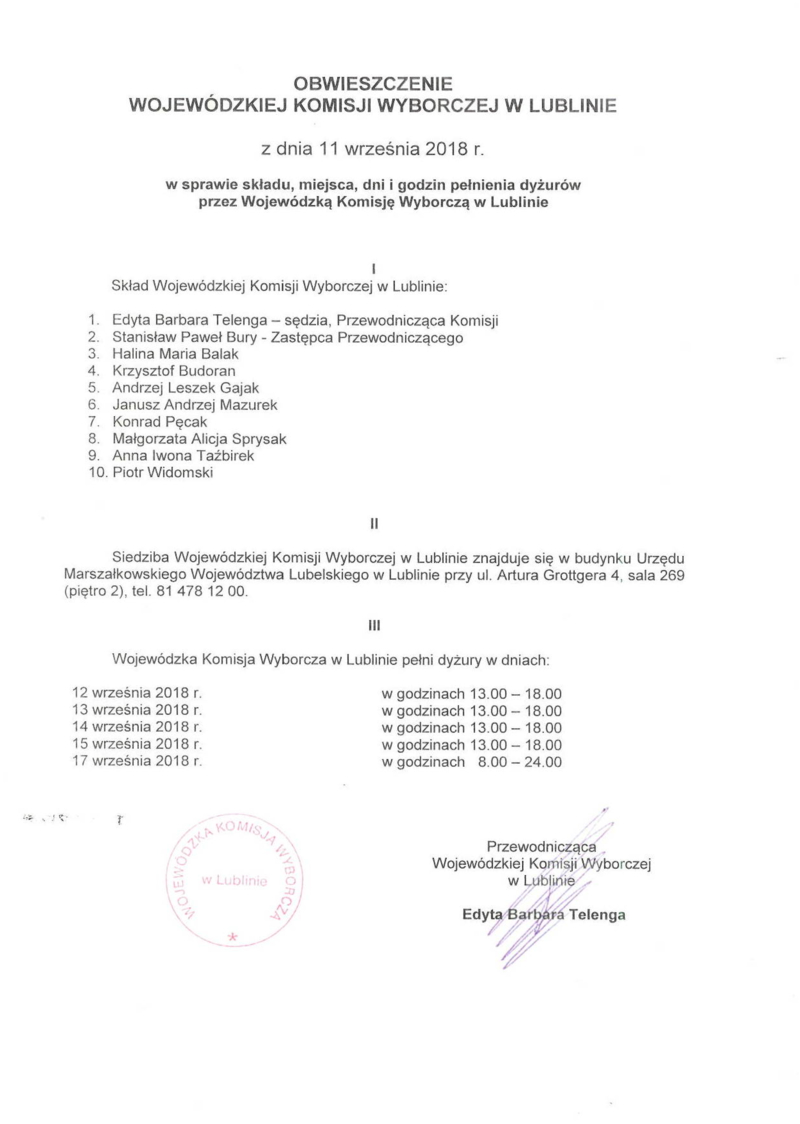 OBWIESZCZENIE WOJEWÓDZKIEJ KOMISJI WYBORCZEJ Z DN. 11.09.2018R.