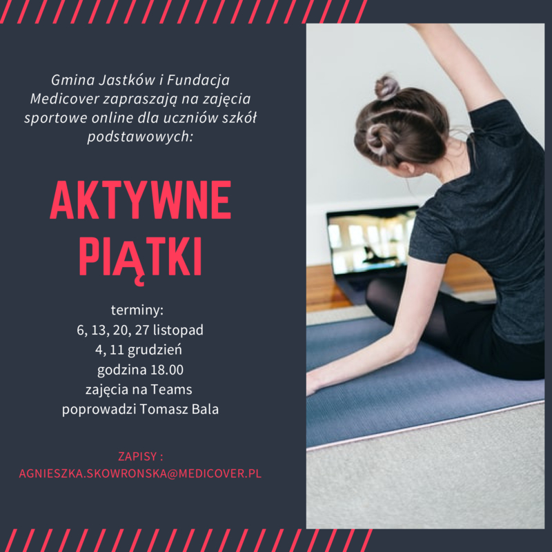 Zbliżamy się do końca realizacji Gminnego Programu Profilaktyki Nadwagi i Otyłości w Gminie Jastków w 2020 roku. To już ostatnia szansa w tym roku na włączenie się w działania. Tym razem chcemy zachęcić uczniów do wzięcia udziału w zajęciach sportowych online  - „Aktywne Piątki” w Gminie Jastków. ,,Aktywne piątki” poprowadzi doświadczony specjalista aktywności fizycznej - Tomasz Bala utytułowany kolarz przełajowy i tandemowy, trener kolarstwa i trener personalny. Pan Tomasz jest również utytułowanym zawodnikiem w Kadrze Narodowej. Podczas treningów zaproponuje m.in. ćwiczenia na brzuch i plecy dla uczniów siedzących całe dni przy komputerze. Te ćwiczenia wzmocnią mięśnie i odciążą kręgosłup. W zajęciach mogą brać udział całe rodziny – zaletą korzystania z aplikacji Teams będzie możliwość sprawdzenia przez trenera czy ćwiczenia są wykonywane prawidłowo.