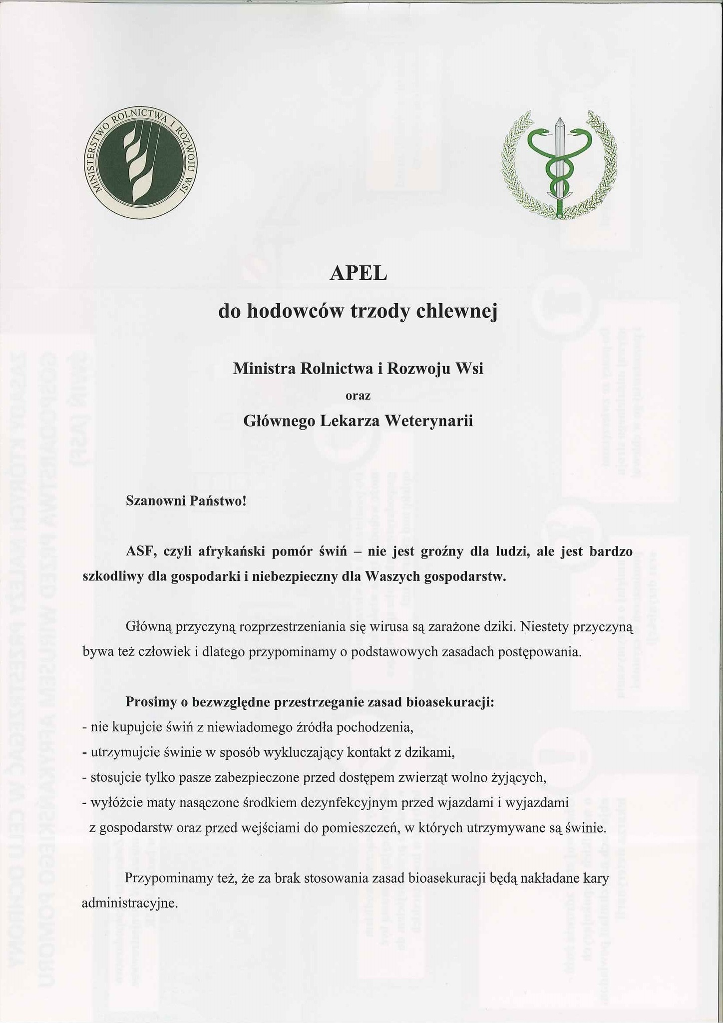 APEL MINISTRA ROLNICTWA I ROZWOJU WSI ORAZ GŁÓWNEGO LEKARZA WETERYNARII SKIEROWANY DO HODOWCÓW TRZODY CHLEWNEJ