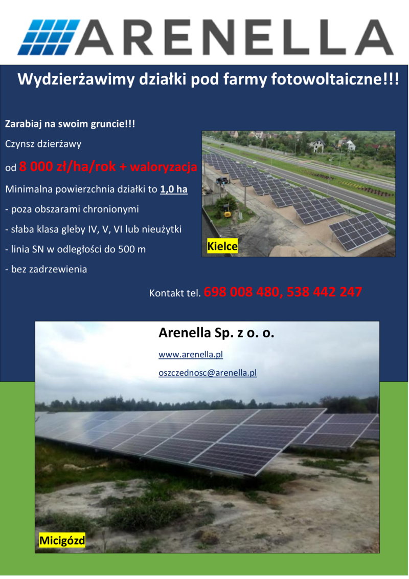 ARENELLA - "WYDZIERŻAWIMY DZIAŁKI POD FARMY FOTOWOLTAICZNE!!!"
