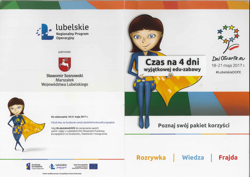 Serdecznie zapraszamy na Dni Otwarte Funduszy Europejskich  w dniach 18-21 maja 2017 r., które odbędą się w aż 10 miejscowościach województwa lubelskiego.  Więcej szczegółów na stronie www.dniotwarte.eu