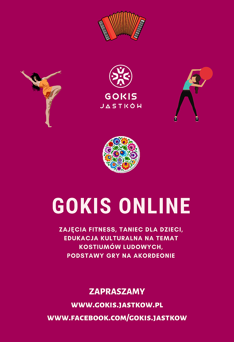 Nie możemy jeszcze spotkać się osobiście na zajęciach, ale zapraszamy do stworzonej specjalnie na ten czas przez Gminny Ośrodek Kultury i Sportu - oferty zajęć online. Wszystkie materiały zamieszczane są na stronie internetowej: www.gokis.jastkow.pl oraz na www.facebook.com/gokis.jastkow
