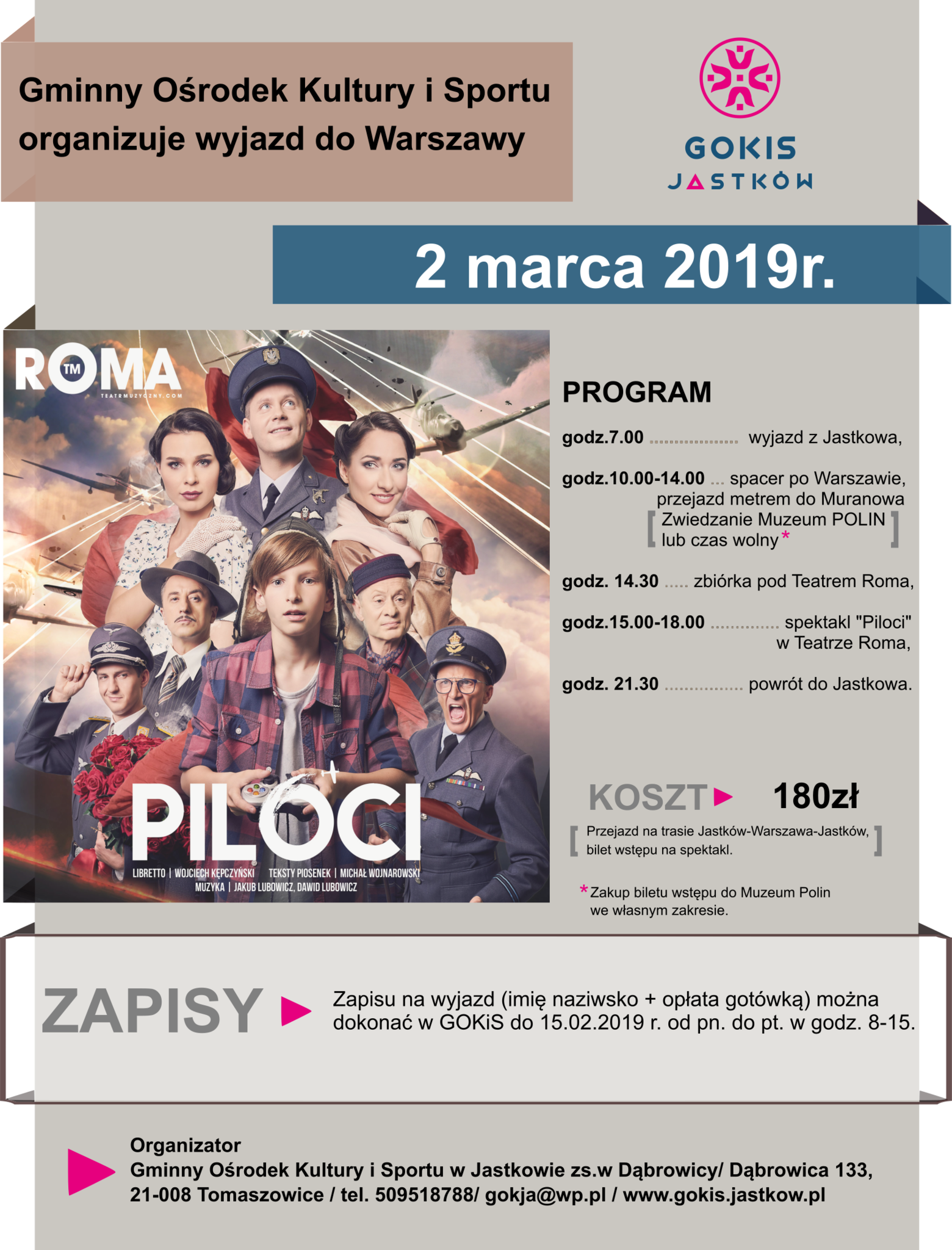 KOSZT 180zł (transport na trasie Jastków-Warszawa-Jastków + bilet na spektakl "Piloci").
