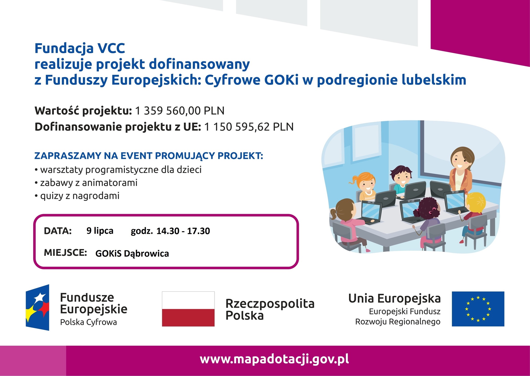 GMINNY OŚRODEK KULTURY I SPORTU ZAPRASZA DZIECI Z RODZICAMI NA FESTYN PROMUJĄCY PROJEKT "CYFROWE GOK-I" - PIĄTEK 9 LIPCA OD GODZ. 14.30 PRZY GOKIS W DĄBROWICY.