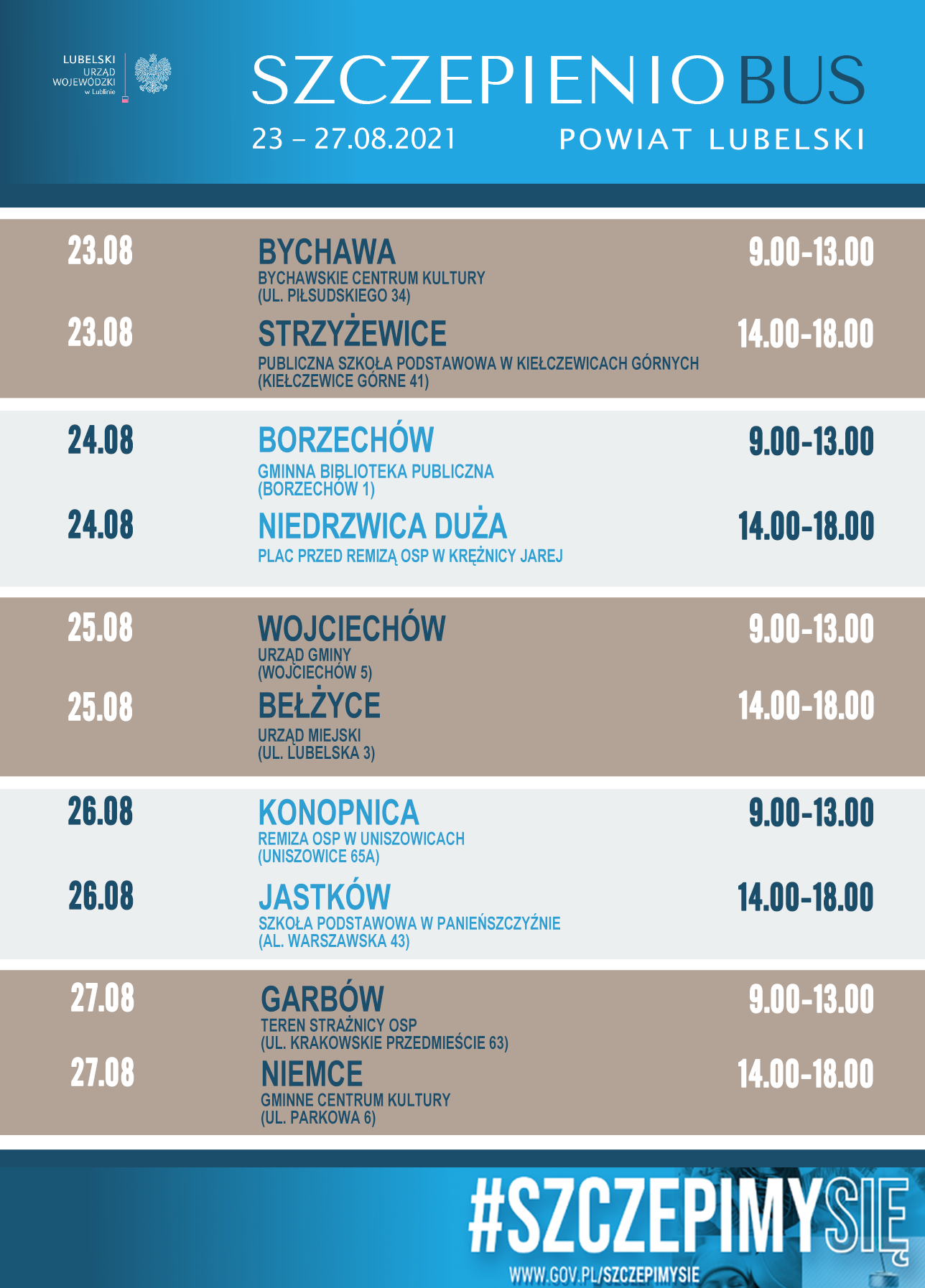 HARMONOGRAM TRASY SZCZEPIENIOBUSA W POWIECIE LUBELSKIM W DNIACH 23-29.08.2021R