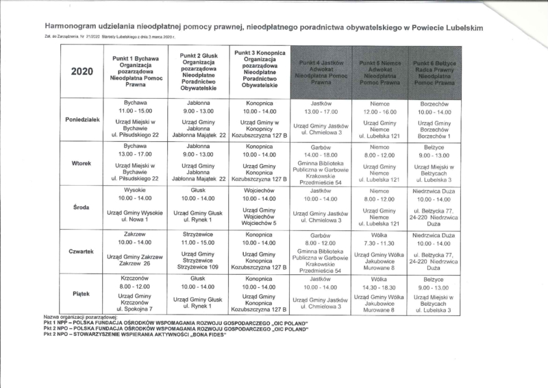 HARMONOGRAM UDZIELANIA NIEODPŁATNEJ POMOCY PRAWNEJ