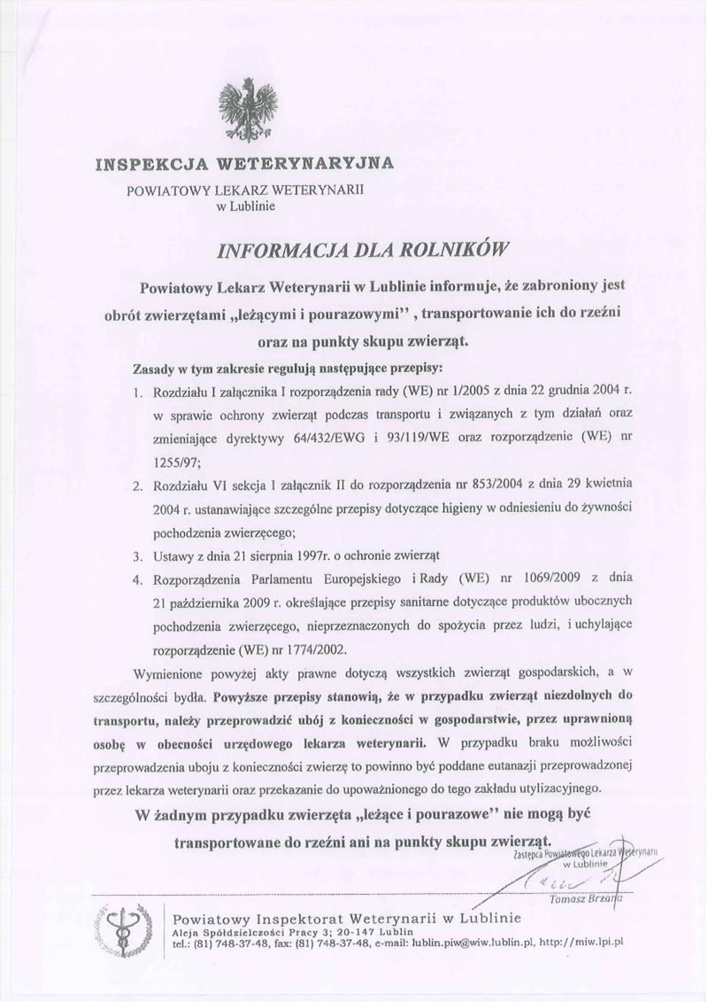 Powiatowy Lekarz Weterynarii w Lublinie informuje, że zabroniony jest obrót zwierzętami "leżącymi i pourazowymi", transportowanie ich do rzeźni oraz na punkty skupu zwierząt.