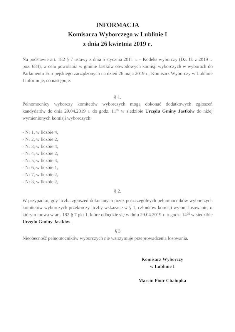 INFORMACJA KOMISARZA WYBORCZEGO W LUBLINIE I Z DNIA 26 KWIETNIA 2019 R.