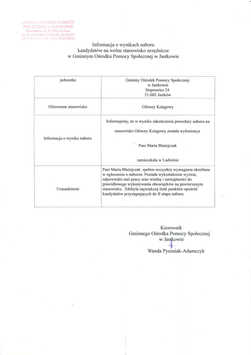 INFORMACJA O WYNIKACH NABORU KANDYDATÓW NA WOLNE STANOWISKO URZĘDNICZE W GMINNYM OŚRODKU POMOCY SPOŁECZNEJ W JASTKOWIE