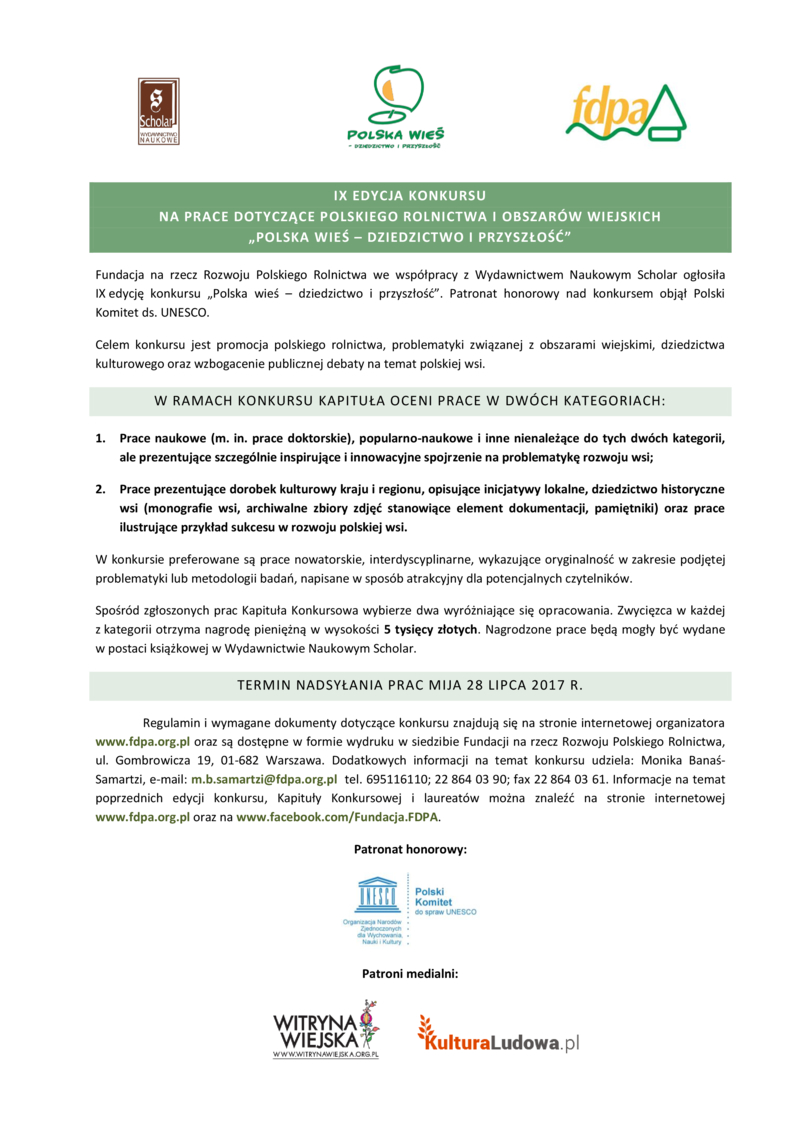 Fundacja na rzecz Rozwoju Polskiego Rolnictwa we współpracy z Wydawnictwem Naukowym Scholar ogłosiła IX edycję konkursu „Polska wieś – dziedzictwo i przyszłość”. Patronat honorowy nad konkursem objął Polski Komitet ds. UNESCO. Celem konkursu jest promocja polskiego rolnictwa, problematyki związanej z obszarami wiejskimi, dziedzictwa kulturowego oraz wzbogacenie publicznej debaty na temat polskiej wsi.