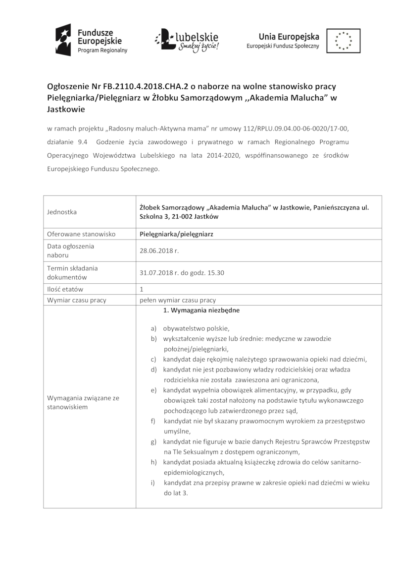 OGŁOSZENIE NR FB.2110.4.2018.CHA.2 O NABORZE NA WOLNE STANOWISKO PRACY PIELĘGNIARKA/PIELĘGNIARZ W ŻŁOBKU SAMORZĄDOWYM ,,AKADEMIA MALUCHA” W JASTKOWIE