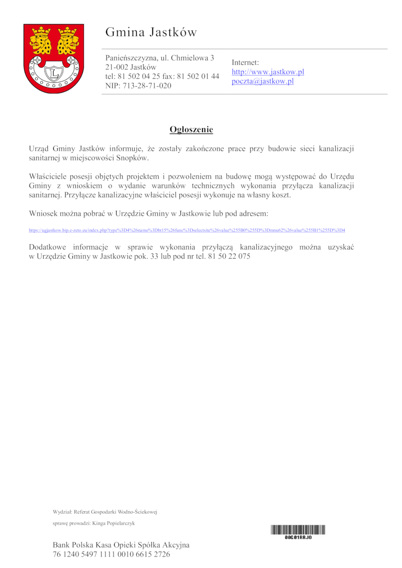 OGŁOSZENIE O NOWEJ SIECI KANALIZACJI SANITARNEJ W M. SNOPKÓW
